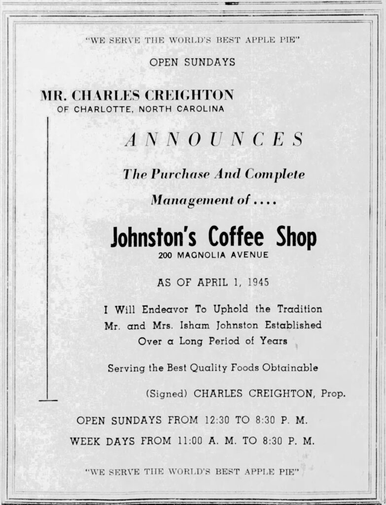 Financial complications soon followed, and by February 1945 the Johnstons had resumed control of the business, publicly announcing that any debts incurred during the lease were not their responsibility. Only one month later, in March 1945, they sold Johnston’s Coffee Shop to Charles Creighton, a restaurateur from North Carolina who had previously operated Creighton’s Restaurant in Asheville. There, advertisements frequently promoted his establishment’s “green apple pie,” suggesting that Creighton arrived in Daytona Beach with his own ideas about how to market a signature dessert.
